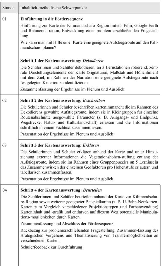 Im Anschluss erfolgte zunächst eine Diagnose in Form einer intensiven Eruierung potenzieller Lernschwierigkeiten mittels der einschlägigen internationalen Forschungsliteratur zu Schülerkognition, theoretischer Kartographie und Kartendidaktik. So ließen sich neben wirksamen Heterogenitätsaspekten und darauf basierenden Herausforderungen im kartographischen Auswertungsprozess auch theoretische Hinweise zu möglichen Förderarrangements ableiten.