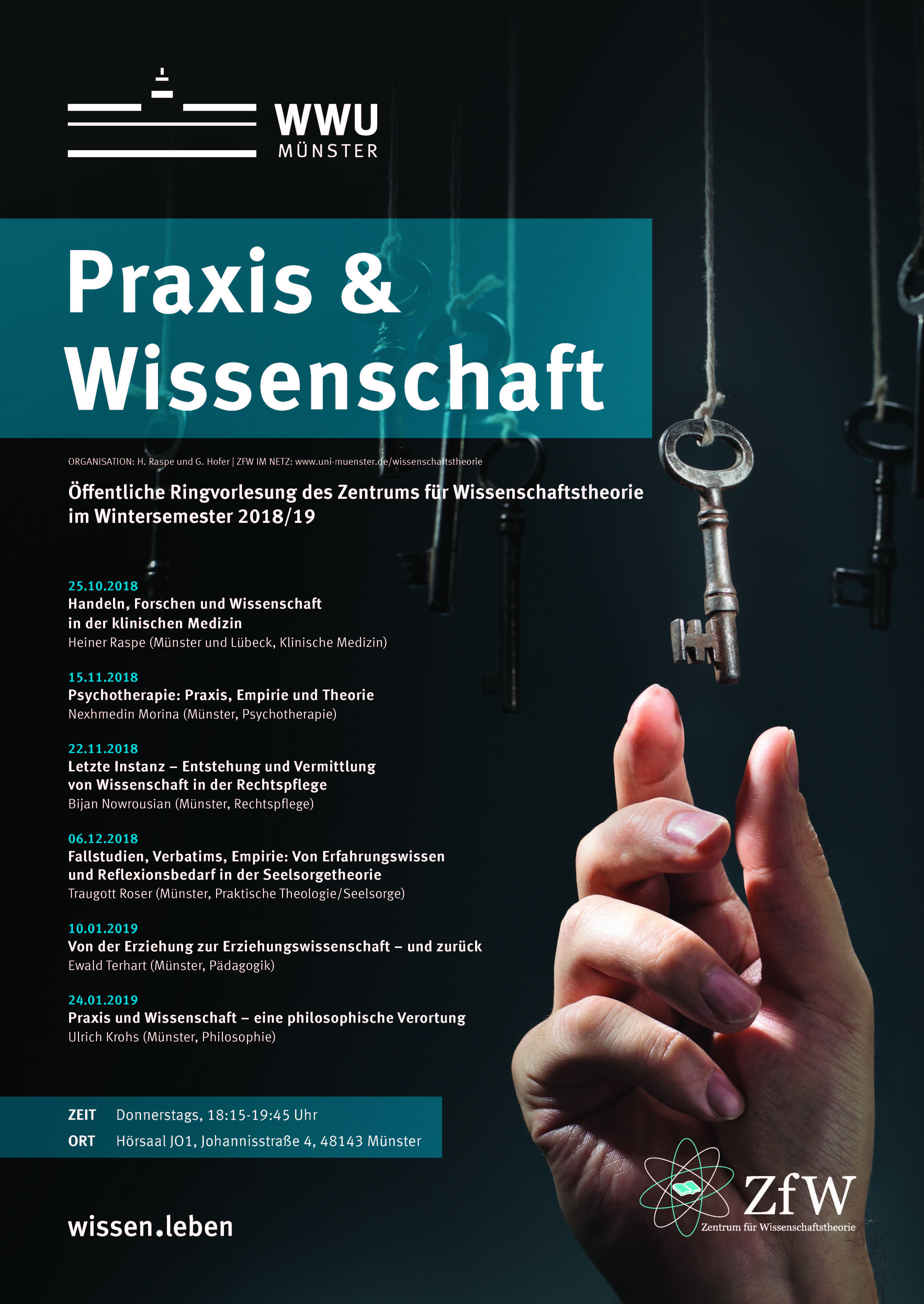 Die Vorträge der von Heiner Raspe und Georg Hofer organisierten Reihe fanden etwa zweichwöchentlich am Donnerstagabend ab 18 Uhr c.t. im Hörsaal J01 (Johannisstraße 4) statt.