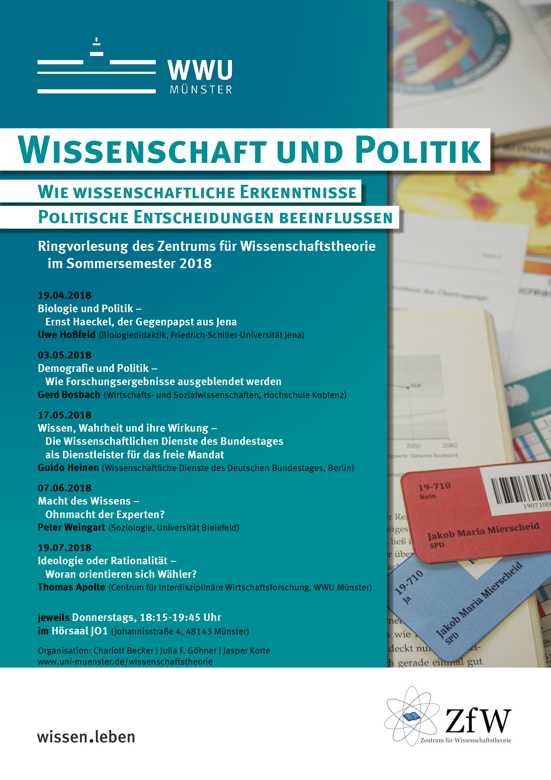 Die Ringvorlesung im Sommersemester 2018 stand unter dem Titel "Wissenschaft und Politik - Wie wissenschaftliche Erkenntnisse politische Entscheidungen beeinflussen". Sie wurde von Charlott Becker, Julia F. Göhner und Jasper Korte organisiert.