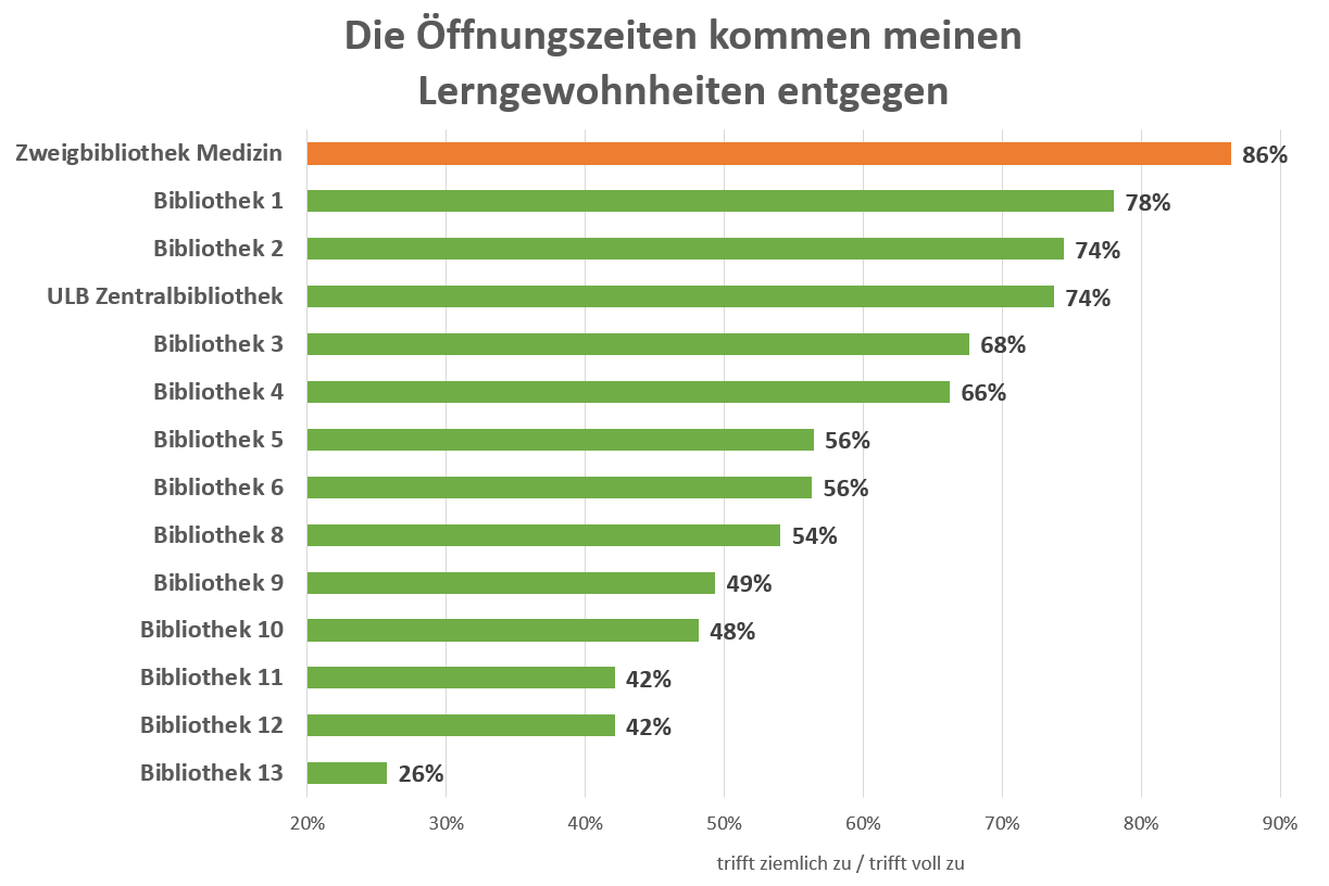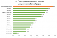 Leider ist – aus Datenschutzgründen – kein Vergleich mit anderen Medizinbibliotheken in NRW möglich. So bleibt „nur“ der Vergleich mit größeren Bibliotheken der anderen Fachgebiete in Münster, wie z.B. der Chemiebibliothek, der juristischen Bibliothek usw. aber auch der Unibibliothek. In diesem „Benchmarking“ zeigt sich, dass an keiner Bibliothek in Münster die Benutzer so zufrieden sind mit den Öffnungszeiten wie an der Zweigbibliothek Medizin (Abb. siehe oben, N=18-867). Kein Wunder – nimmt die ZB Med doch mit Öffnungszeiten Montag bis Freitag von 8:00-24:00 und Samstag / Sonntag von 10:00-24:00 den Spitzenplatz ein. (Einige Institutsbibliotheken sind zwar rund um die Uhr zugänglich, aber meist nur für die dort Beschäftigten.)