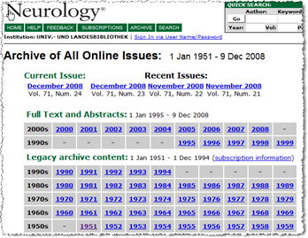 Aus zusätzlichen Mitteln des Dekanats konnte die Bibliothek das Legacy Archive der Zeitschrift Neurology erwerben. Damit stehen Ihnen 12.297 zusätzliche Artikel online zur Verfügung. Der Preis betrug dabei günstige 14 Cent pro Artikel. Sie finden alle Ausgaben ab 1951 zunächst unter der Ovid-Overfläche, später dann auch auf der Homepage der Zeitschrift selber.