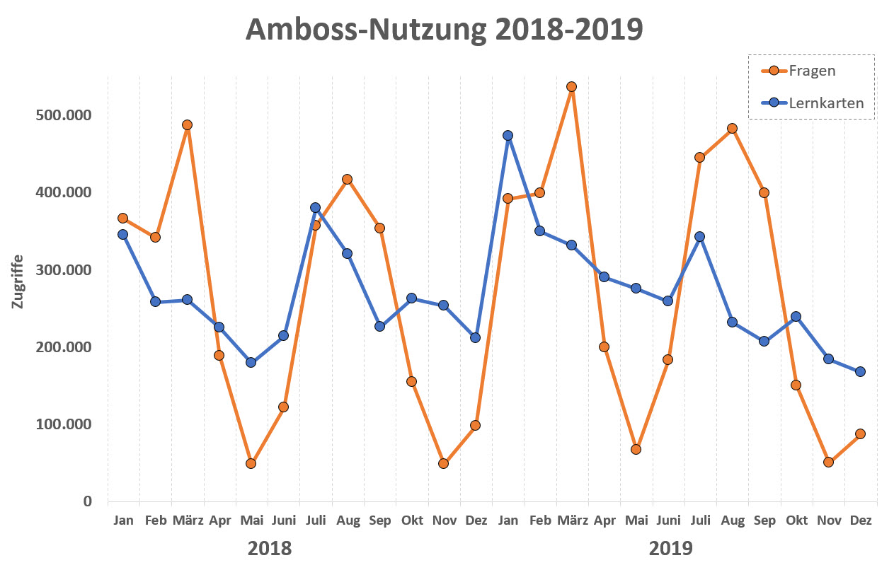 Seit Amboss lizenziert ist, nimmt die Zahl der mit anderen Tools gekreuzten Fragen in der Klinik kontinuierlich ab. Auf der obigen Abbildung sehen Sie die Nutzung von Amboss im Verlauf der Jahre 2018-2019. Bei den Multiple Choice-Fragen sieht man deutlich die heißen Nutzungsphasen vor den Staatsexamina im Frühjahr und Herbst. Die Lernkarten werden fast ebenso sehr stark genutzt, die Nutzung schwankt aber nicht erkennbar mit den Prüfungen, eher mit den Semesterabschlussprüfungen: Anstiege sind im Januar und Juli zu verzeichnen.