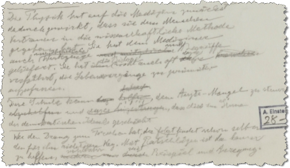 Eine wahre Fundgrube! Ein Beispiel für ein Digitalisat mit Medizinbezug ist folgende Antwort Einstein’s auf vier biographische Fragen anläßlich der Namensgebung des Albert Einstein College of Medicine 1953.