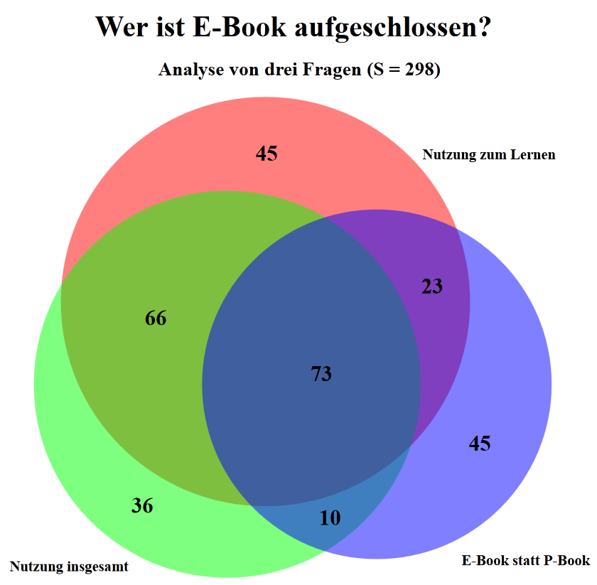 Wie nicht anders zu erwarten, ist die Überlappung der „affinen“ Antworten auf diese drei doch sehr ähnlichen Fragen recht groß: So gibt sich die Mehrheit (58%) bei zweien der drei Fragen(gruppen) als e-book-affin zu erkennen, und fast ein Viertel (24%) sogar bei allen dreien. Immerhin 42% der Antwortenden zeigt jedoch nur bei einer Frage (= Charakterisierung) ganz auf der Seite der E-Books und nimmt zu den übrigen beiden Fragen eher eine neutrale oder (seltener) negative Haltung ein.