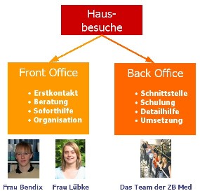 Während Frau Lübke und Frau Bendix als so genanntes „Front-Office“ für Erstkontakt und Beratung zuständig sind, stehen im „Back-Office“ mehrere erfahrene Kollegen und Kolleginnen, die Experten auf ihrem jeweiligen Gebiet sind, für weitergehende Auskünfte und Fragen sowie für die Organisation von Schulungen zur Verfügung. Wenn Sie Informationsbedarf haben oder uns einfach einmal kennen lernen wollen, kommen die Informationsberaterinnen der Zweigbibliothek gerne mal bei Ihnen vorbei. Bitte machen Sie unter zbm.auskunft@uni-muenster.de oder Telefon 83-58560 einen Termin mit uns aus. Als Teil einer Informationsoffensive, welche die Bibliothek im November 2007 mit der Taskforce Bibliothek+Fachschaft startete, richtet sich dieses Projekt an die Wissenschaftler und Ärzte der Medizinischen Fakultät.