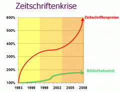 Unser Ziel ist es damit, für den freien Zugang zu Wissen und Information aus öffentlich geförderter Forschung zu werben, und Sie über die Möglichkeiten von Open Access zu informieren. Fangen wir mal beim akademischen Publikationswesen an. Eine der gründe für die gegenwärtige Zeitschriftenkrise ist, dass das Publikationswesen zwei Herren dient: Für die Autoren ist es die wichtigste Quelle der wissenschaftliche Karriere, für Verlage ist es die wichtigste Quelle hoher Profite. Da jede Zeitschrift ein Minimonopol darstellt (oder können Sie einen Nature-Artikel irgendwo anderes als bei Nature kaufen?), können die Preise diktiert und risikolos Renditen von 30% und mehr erzielt werden. Im Haifischbecken der Fachverlage haben sich immer größere und gierigere Konzerne gebildet, die das Zeitschriftensystem diktieren. Dabei werden sie von den Wissenschaftlern unterstützt, die auf Gedeih und Verderb publizieren müssen. Das einst so stabile System der wissenschaftlichen Fachzeitschriften hat deshalb mittlerweile eine schwere Schieflage bekommen, da kein Bibliotheksetat der Welt mit den steigenden Abonnementspreisen mithalten konnte: