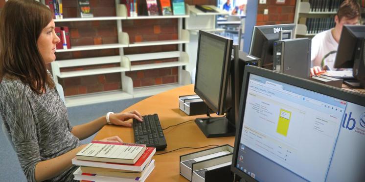 Ein PC für den KatalogPlus steht im Bereich der Leihstelle.Recherchen in Fachdatenbanken und Internet