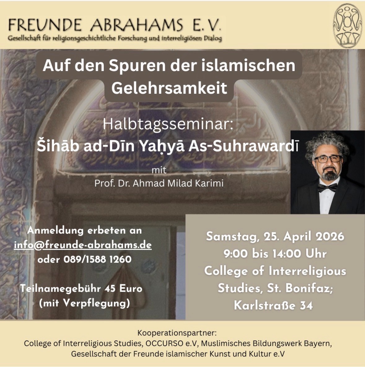 Am 25. April 2026 wird Professor Dr. Ahmad Milad Karimi im College of Interreligious Studies St. Bonifaz in München ein Halbtagsseminar unter dem Titel „Auf den Spuren der islamischen Gelehrsamkeit“ leiten. Im Mittelpunkt steht der Philosoph und Mystiker Šihāb ad-Dīn Yaḥyā as-Suhrawardī, dessen Denken zu den markanten Stimmen der islamischen Geistesgeschichte zählt. Das Seminar eröffnet die Möglichkeit, zentrale Texte und Motive der islamischen Tradition in einem interreligiösen Bildungszusammenhang zu erschließen.