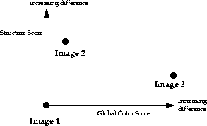 For matching, assume Image 1 is the comparison image, and Image 2 and Image 3 are each being compared with Image 1. With respect to the global color attribute plotted on the X axis, the distance between Image 1 and Image 2 is relatively small (for example, 15), whereas the distance between Image 1 and Image 3 is much greater (for example, 75). If the global color attribute is given more weight, then the fact that the two distance values differ by a great deal will probably be very important in determining whether or not Image 2 and Image 3 match Image 1. However, if global color is minimized and the structure attribute is emphasized instead, then Image 3 will match Image 1 better than Image 2 matches Image 1.