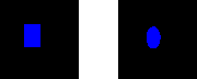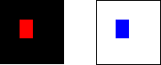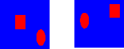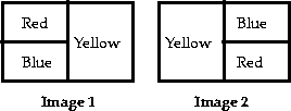 Image 1 and Image 2 are the same size and are filled with solid colors. In Image 1, the top left quarter (25%) is red, the bottom left quarter (25%) is blue, and the right half (50%) is yellow. In Image 2, the top right quarter (25%) is blue, the bottom right quarter (25%) is red, and the left half (50%) is yellow.