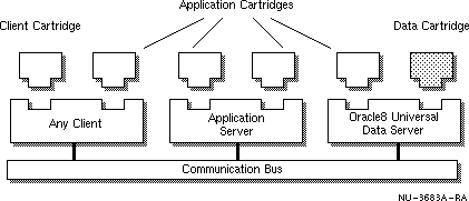 Within the Oracle Network Computing Architecture (NCA), data cartridges facilitate the storage and retrieval of complex data types required by nontraditional database applications, such as geographic information systems, imaging, workflow, document management, and digital libraries. These applications are built using components or modules that support the capture, input, processing, analysis, storage, retrieval, and display of the complex data types. Figure 1-1 shows the relationship between data cartridges and NCA.