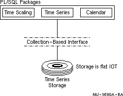 Figure 2-3 shows the Time Series cartridge architecture. At the lowest level, a storage option is required, and for the initial release this must be a flat index-organized table (IOT). For future releases, nested IOT and VARRAY storage options are planned. The actual cartridge consists of PL/SQL packages for calendar, time series, and time scaling functions. In addition, a collection-based interface between time series storage and the packaged functions is provided.