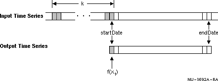 The relationship between the input and output time series in the computation of a moving average or sum is illustrated in Figure 2-5. The figure focuses on the common invocation of moving average or sum, where k is the number of timestamps in the look-back window (for example, 30) and a date range (startDate and endDate) is supplied. (For more information about the parameters, see the Mavg function description in Chapter 5.)