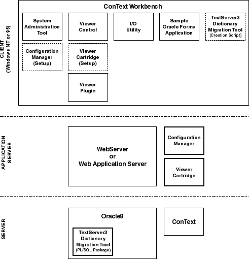 In contrast, the Configuration Manager and Viewer Cartridge must be configured to work with Oracle WebServer or Web Application Server. Similarly, the PL/SQL package for the TextServer3 Dictionary Migration tool must be created in the Oracle8 database that contains the TextServer3 data dictionary to be migrated. Figure 1-2 illustrates the location of these components after configuration has been completed.