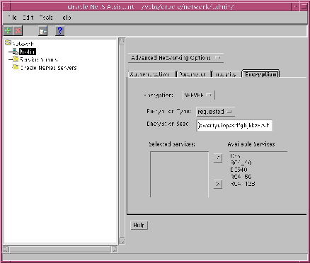 The following instructions assume you are using the Oracle Net8 Assistant configuration tool. Configure Servers to use encryption as follows. Refer to Figure 2-1, "Oracle Net8 Assistant Profile Encryption Tab".