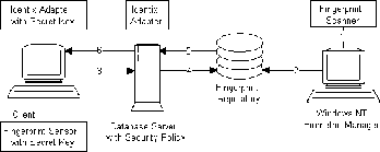 Each user who wants to use the system must place a fingerprint on a TouchNet II Desktop Sensor. The client-side adapter sends an authentication request to the server-side adapter which uses the previously enrolled fingerprint stored in the authentication server for comparison. For each authentication request from a client, the authentication server retrieves and sends the user's fingerprint and the database server's security policy back to the client-side adapter via the server-side adapter.