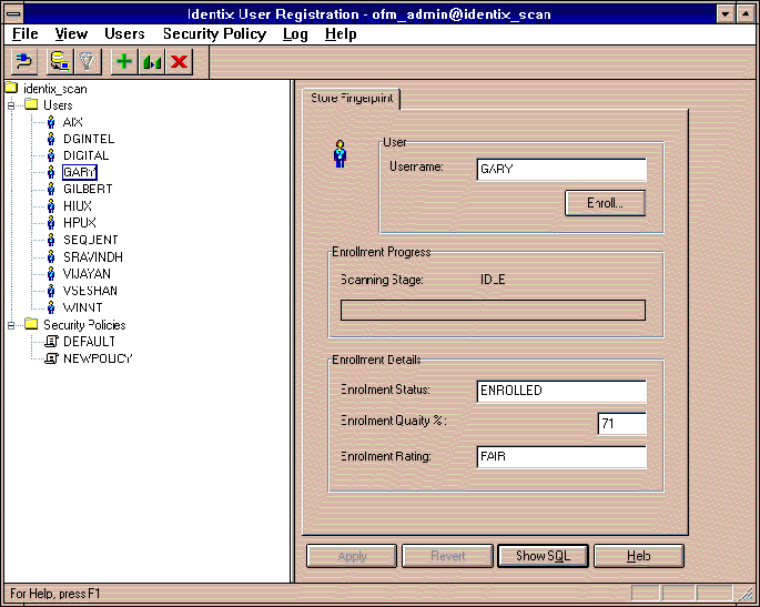 Figure 6-7 Identix User Registration Window with Expanded Object Tree