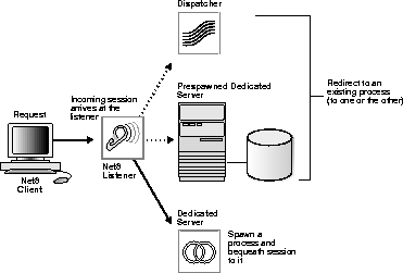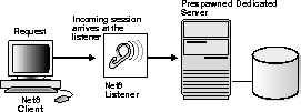 Figure 2-3 depicts the role of the network listener in a redirected connection to a prespawned dedicated server process.