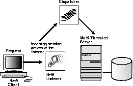 When an Oracle server has been configured as a multi-threaded server, incoming sessions are always routed to the dispatcher unless either the session specifically requests a dedicated server or no dispatchers are available. The sequence of events that occurs with the dispatcher server is as follows: