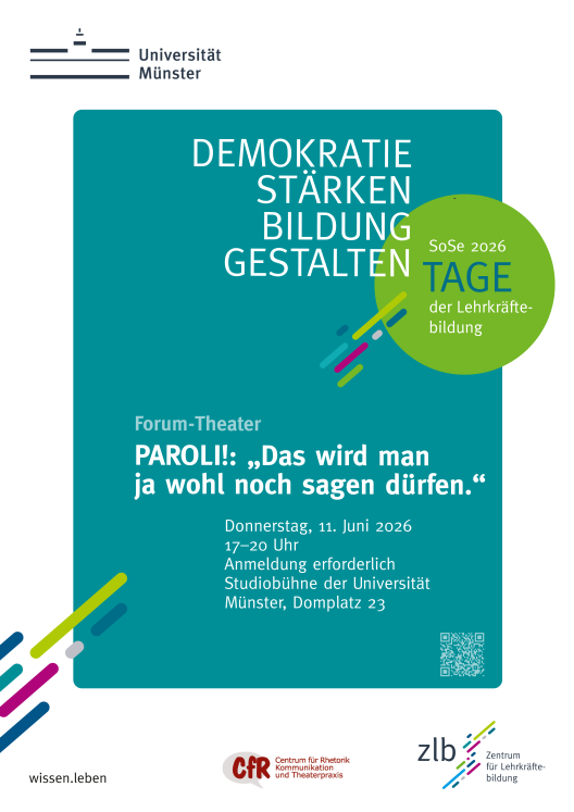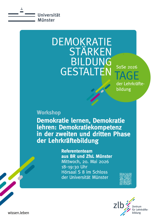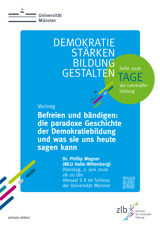 Demokratie lernen, Demokratie lehren: Demokratiekompetenz in der zweiten und dritten Phase der Lehrkräftebildung (LRSD Sven Lutzka, Bezirksregierung Münster, Dez. 46.01; LD Ulrich Speckenwirth, Zentrum für schulpraktische Lehrerausbildung Münster, u. a.) - 2. Juni 2026: Fachübergreifender Vortrag
