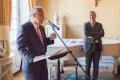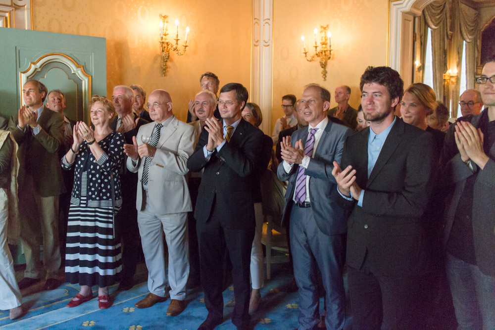 Wielenga zeigte sich tief berührt von der Auszeichnung, machte aber gleichzeitig deutlich, dass an dieser Anerkennung viele Anteil hätten. Angefangen bei seinem Mentor Prof. Dr. Jürgen Hess von der Freien Universität Amsterdam nannte Wielenga viele der geladenen Gäste namentlich, darunter neben seiner Familie aktuelle und frühere Weggefährten aus Politik, Wissenschaft und Kultur beider Länder, und bedankte sich für die gemeinsame Arbeit im deutsch-niederländischen Kontext. Er zitierte in seiner Ansprache den deutschen Außenminister Frank Walter Steinmeier, der auf dem deutsch-niederländischen Forum 2014 die Beziehungen beider Länder als „nie besser gewesen“ charakterisierte. Wielenga betonte, auch an sehr guten Beziehungen müsse man arbeiten, damit diese so gut bleiben könnten und dies könne man nicht allein, sondern nur gemeinsam. Besonderen Anteil an der Auszeichnung sprach er seinen Kolleginnen und Kollegen vom Zentrum für Niederlande-Studien in Münster zu, das im vergangenen Jahr sein 25-jähriges Jubiläum feierte. In Lehre und Forschung sowie mit zahlreichen Kolloquien, Tagungen und Ausstellungen für eine breite Öffentlichkeit setze man sich gemeinsam täglich für das gegenseitige Verständnis beider Länder ein: „Ihr seid ein fantastisches Team.“