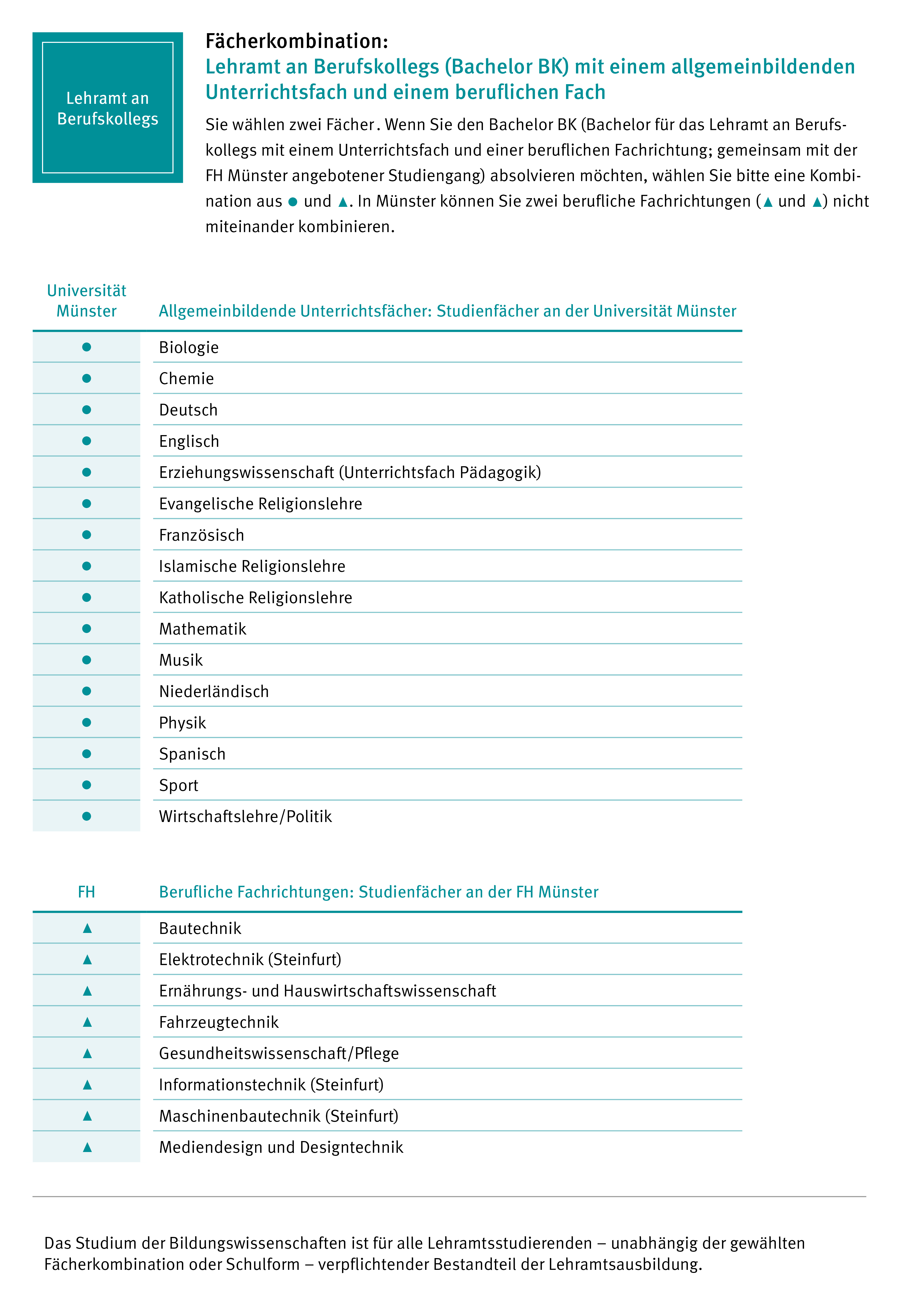 Lehramtsstudierende müssen eine Schulform auswählen. An der Universität Münster kann man mit dem Ziel Lehramt an Grundschulen, Lehramt an Haupt-/Real-/Sekundar- und Gesamtschulen, Lehramt an Gymnasien und Gesamtschulen, Lehramt an Berufskollegs sowie Lehramt für sonderpädagogische Förderung (neu seit WS 23/24) studieren. Für jede Schulform sind unterschiedliche Fächerkombinationen studierbar.