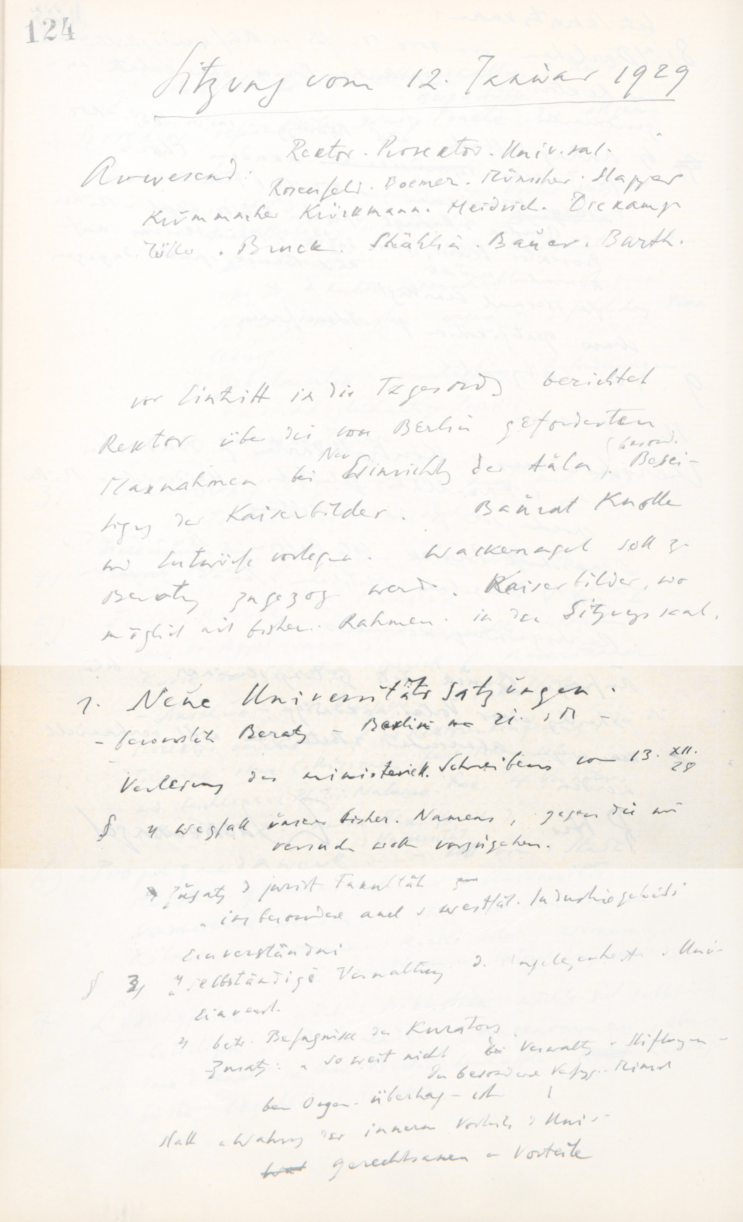 Im Protokoll der Senatssitzung am 12. Januar 1929 wird unter Tagesordnungspunkt 1 über die bevorstehende Satzungsänderung beraten. Die Ergebnisse sollen Grundlage für eine Beratung in Berlin am 21. Januar sein.