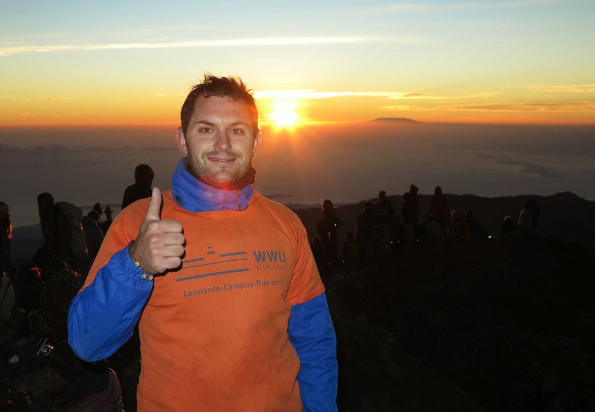 Sonnenaufgang auf dem Gipfel des Vulkans "Rinjani": Auf der indonesischen Insel Lombok posierte Benedikt Lenz, Mitarbeiter des Instituts für Genossenschaftswesen der WWU.© privat