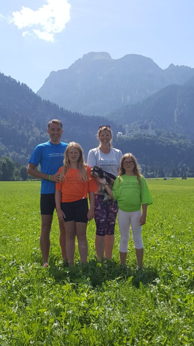 WWU-Shirts für die ganze Familie – WWU-Mitarbeiter Thomas und Anja Böckenholt besuchten mit den zwei Töchtern und Hündin Muffin die Schlösserlandschaft des Allgäus. © privat