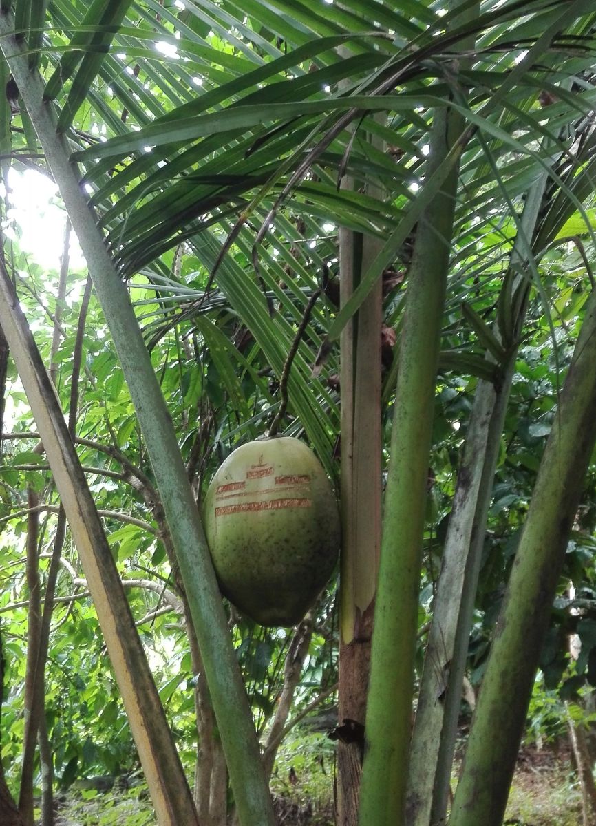 Was steckt denn da im Baum? WWU-Mitarbeiterin Preeya Vettikuzha schnitzte bei ihrem Indien-Urlaub spontan das Uni-Logo in eine Kokosnuss. © privat