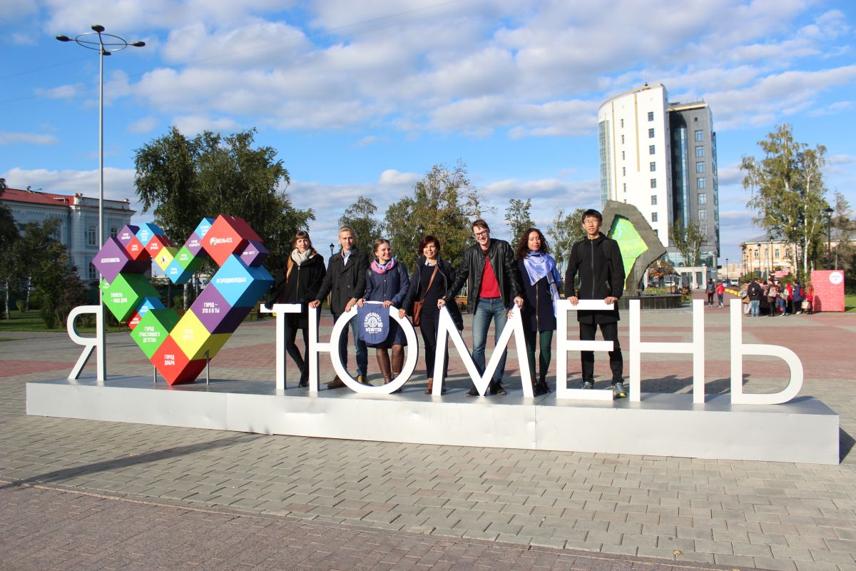 Während ihres zweitätigen Aufenthalts in Tjumen kam die sibirische Sonne raus und die WWU-Mitarbeiterinnen Johanna Hinz (links) und Albina Haas (Mitte) konnten mit Studierenden die Campusatmosphäre genießen.© privat