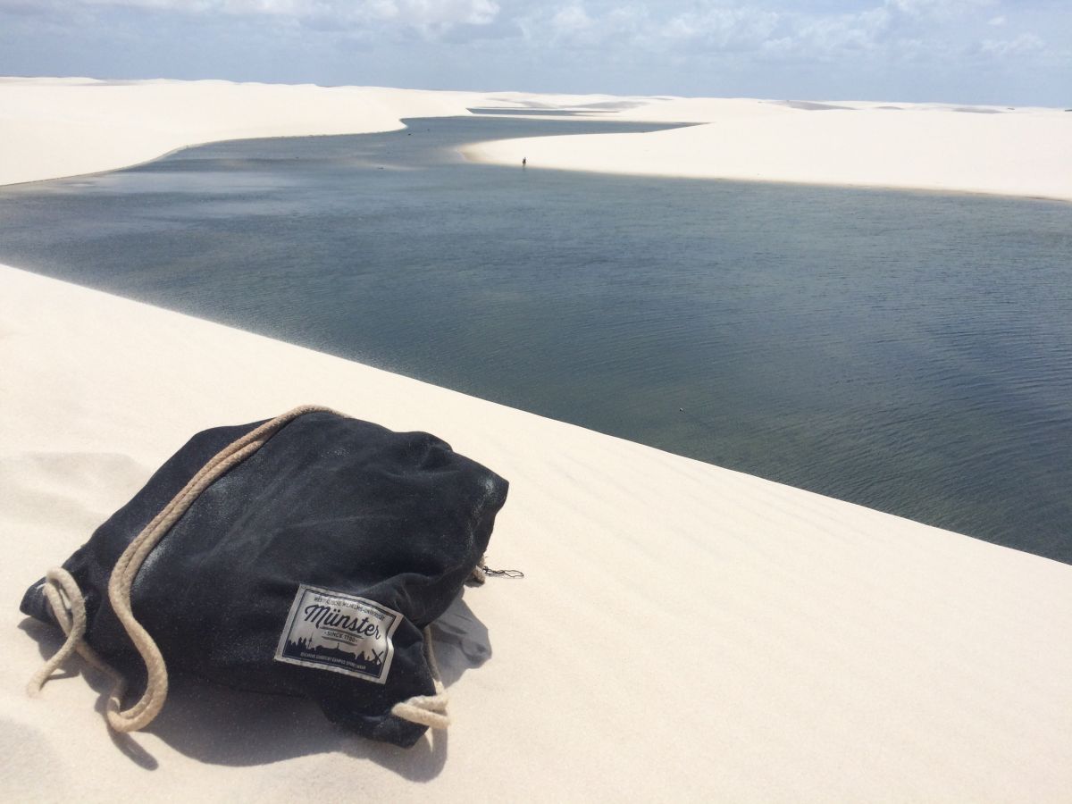Ein treuer Begleiter und eine Erinnerung an Münster: WWU-Studentin Lena Harlos setzte ihren Münster-Turnbeutel in den Sanddünen Lençois Maranhenses im Norden von Brasilien in Szene. © privat