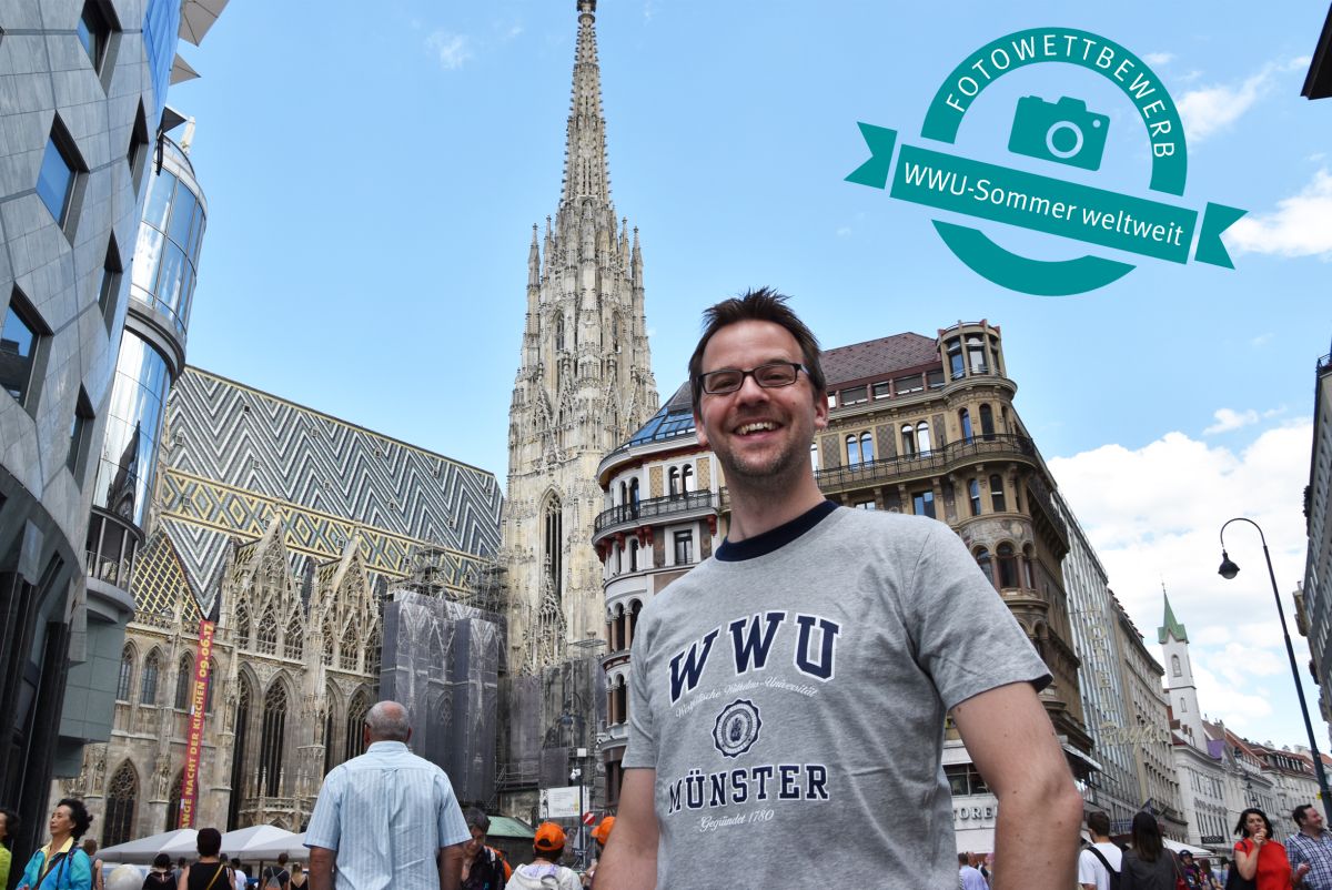 Werbung für die WWU in Wien: Dr. Daniel Nölleke demonstriert vor dem Stephansdom seine Verbundenheit mit der Universität Münster. © privat