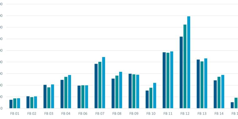 Hauptnutzfläche nach Fachbereichen (ohne Medizin; in m2), Fünf-Jahres-Entwicklung