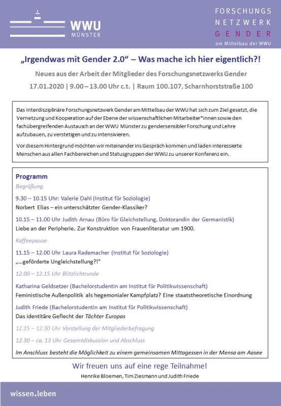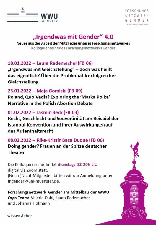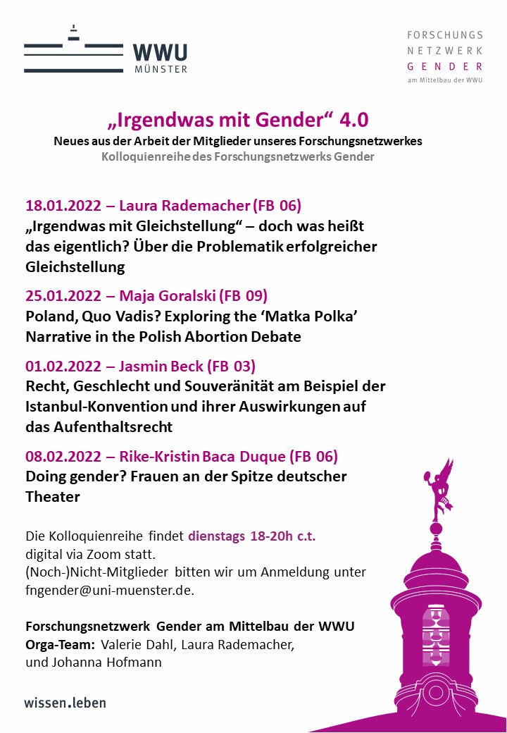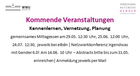 als Forschungsnetzwerk leben wir vom Austausch miteinander, der in diesem Semester vor allem digital stattfindet. Gern laden wir euch ein, genau dafür aktiv unseren Mailverteiler zu nutzen - solltet ihr noch nicht Mitglied sein, schreibt uns gern eine Mail an fngender@uni-muenster.de und wir fügen euch hinzu.