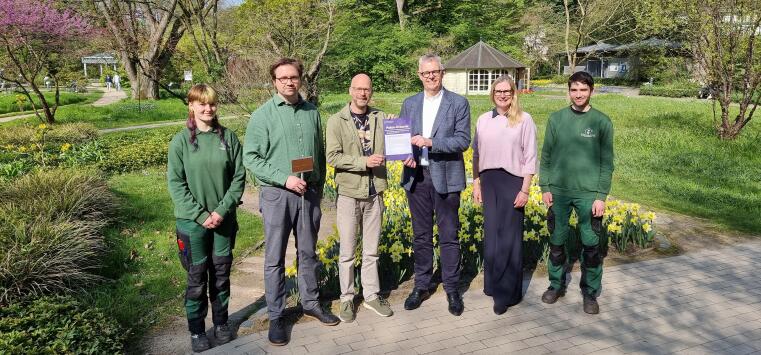 The new garden bed created by the Botanical Garden’s trainees will not only impress with its plant diversity but also convey an important message: Trainees April Martin and Florian Hartig have developed a concept that demonstrates how biodiversity and insect conservation can truly work in your own garden. Instead of invasive species like the butterfly bush, the guide presents native alternatives that not only provide nectar but also serve as a habitat for caterpillars, wild bees, and butterflies. A key concern was the emphasis on the changing seasons. Plants do not lose their value once they have finished blooming—they serve as important nesting and overwintering sites. From caterpillar food plants to winter shelters—the “Apprentice Bed” takes species conservation all the way. The planting will be on display in the middle of the barefoot path starting in May. Visitors to the garden are warmly invited to find inspiration on how they can create a home for biodiversity in their own gardens. The Sparkasse Münsterland Ost has taken on sponsorship of the bed.
