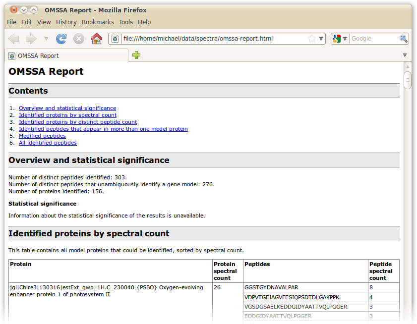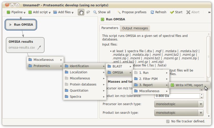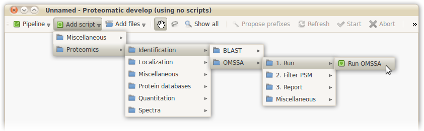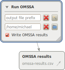 The OMSSA script has an output file activated by default (OMSSA results). Clicking on the arrow beside Run OMSSA in the script box shows all possible output files, each of which can be enabled or disabled. In addition, you can specify an output file prefix, which is prepended to the filename of every output file.