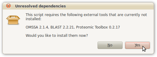 If a script requires external tools, you will be asked whether these tools should be downloaded automatically. Click Yes to continue. Proteomatic will attempt to download the right packages for your system from the Internet.