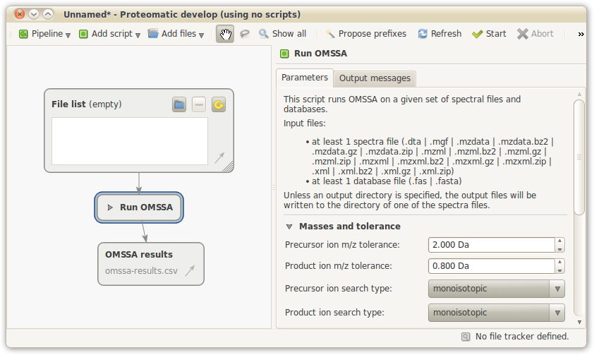 In order to provide the Run OMSSA script with some input files, add a spectral file and a protein database to the file list. You can do this via drag and drop from a file browser or by using the blue folder button in the file list box.