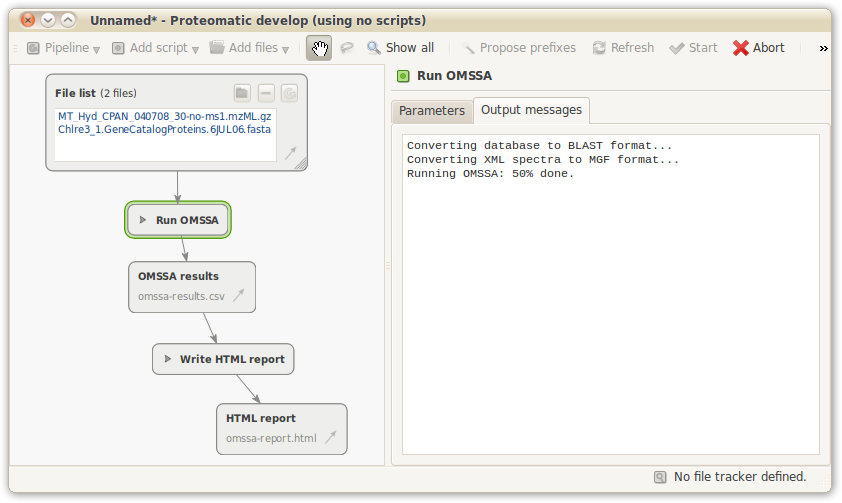 When the pipeline is finished, press Start to run the pipeline. A green frame indicates the currently running script, output messages are shown in the right-hand pane. Whenever an error occurs in a script, the pipeline is stopped and the failing script is indicated by a red frame.