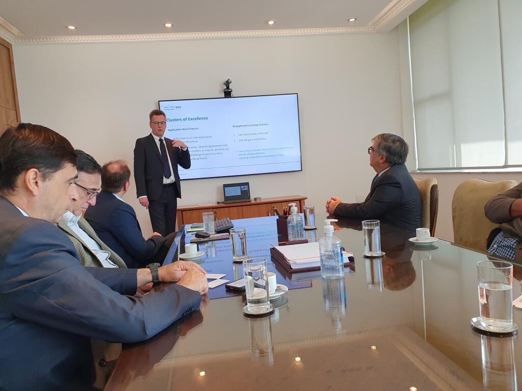 An diesem Vormittag hat ein Großteil des Rektorats mit Rektor Prof. Dr. Carlos Gilberto Carlotti Júnior in der 4. Etage des großen weißen Gebäudes Platz genommen. „Wir wollen gerne noch enger mit die WWU zusammenarbeiten“, unterstreicht Prorektor Prof. Dr. Marcio de Castro Silva Filho. Johannes Wessels stellt die WWU mit ihren aktuellen Schwerpunktthemen und Herausforderungen vor. Die Gastgeber interessieren sich besonders für die Exzellenzstrategie, die Unterstützung der WWU von an Gründungen interessierten Studierenden im „REACH EUREGIO Start-up Center“ der WWU und wie man die eigenen Promovenden „stimulieren“ könne, einen Teil ihrer Promotionszeit in Deutschland beziehungsweise an der WWU – oder in Brasilien – zu verbringen.