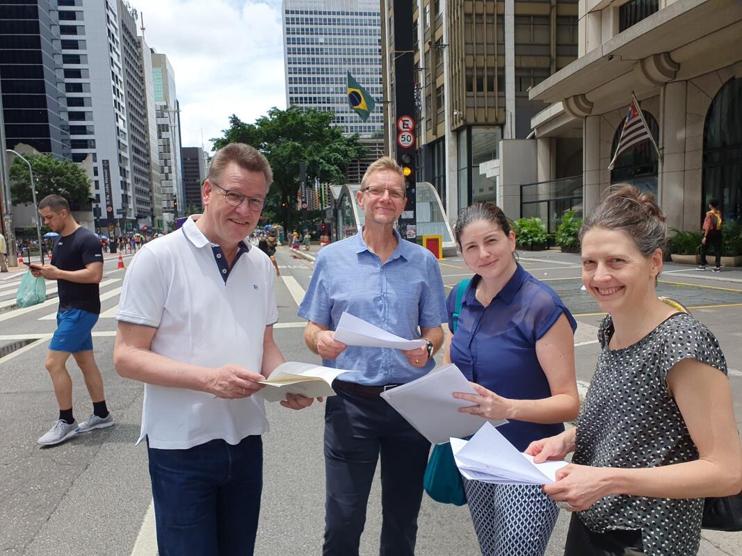 Rektor Prof. Dr Johannes Wessels (l.), der wissenschaftliche Leiter und die Geschäftsführerin des Brasilien-Zentrums der WWU, Prof. Dr. Bernd Hellingrath und Anja Grecko Lorenz (r.) sowie die Leiterin der WWU-Außenstelle in São Paulo, Laura Redondo, tauschten sich auf der am Sonntag autofreien Avenida Paulista in São Paulo über die ersten Programmpunkte aus.© Uni MS - nor Eine lange Anreise, rund 15 Termine an fünf Tagen in drei Städten, zwei abendliche Inlandsflüge: Es ist ein dichtes Programm, das für den Rektor der Universität Münster, Prof. Dr. Johannes Wessels, und eine kleine Delegation aus Münster ab heute (6. Februar) im flächenmäßig fünftgrößten Staat der Erde ansteht. Seit rund 50 Jahren kooperieren WWU-Wissenschaftler mit brasilianischen Kollegen, organisieren zahlreiche Institute den gegenseitigen Austausch von Studierenden und Doktoranden. 2010 gründete die WWU in Folge des stetig steigenden Interesses das „Brasilien-Zentrum“, das seitdem als organisatorisch-wissenschaftlicher Dreh- und Angelpunkt fungiert – die WWU hat sich in dem 215 Millionen Einwohnern zählenden Staat zu einer der aktivsten deutschen Universitäten entwickelt. „Brasilien ist das mit Abstand forschungsstärkste Land in Lateinamerika“, betont Johannes Wessels. „Von dieser Zusammenarbeit profitieren erfahrungsgemäß alle Partner. Und deswegen ist es von großer Bedeutung, dass wir bestehende Kontakte pflegen und neue Kooperationen anbahnen. Ich bin gespannt und freue ich mich auf die Gespräche.“