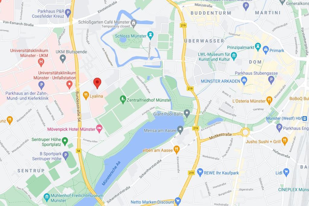 The Schloss – the University's main administrative building – can be reached on foot in about five minutes, and the city centre is only about ten minutes away. With a bus stop right in front of the guesthouses, there is good public transport to all University departments, to Münster’s main station and to the city centre.