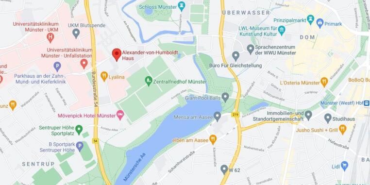 Die zentrale Lage, unweit von Schloß, Aasee und Botanischen Garten, macht die Wohnungen im Alexander-von-Humboldt-Haus besonders attraktiv. Mit der Bushaltestelle, direkt vor der Tür, kann man schnell die Innenstadt und den Hauptbahnhof erreichen. Fußläufig sind auch ein kleiner Lebensmittelmarkt, eine Bäckerei, ein Friseur und eine Apotheke gelegen.
