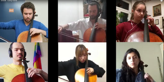Einzelunterricht aus der Ferne – um die Kontakte zu minimieren – kann eine Zeitlang durchaus gut funktionieren. „Unsere theoretischen Fächer wie Musiktheorie und Musikgeschichte bieten wir ebenfalls online an“, erläutert Studiendekanin Barbara Plenge. Orchester und Chöre können online jedoch nicht miteinander proben. Derzeit vermitteln zwar etliche Videos im Netz den Eindruck, dass Streicher, Bläser oder Sänger vermeintlich aus dem Homeoffice zusammen ein Stück aufführen. Die Stimmen sind dann jedoch einzeln eingespielt und anschließend zusammengeschnitten worden. Cellisten der Klasse Prof. Matias De Oliveira Pinto haben auf diese Weise ein Video (s.u.) mit dem Adagio aus Dvořáks Sinfonie „Aus der Neuen Welt“ aufgenommen, in einer Bearbeitung für Celloensemble durch den brasilianischen Studenten Renan Moreira.