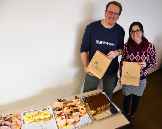 Der Konferenzraum im fünften Stock des Ost-Turms im Universitätsklinikum Münster ist donnerstagmittags immer gut besucht. Von 12 bis 13 Uhr treffen sich Nachwuchswissenschaftler dort zum "Brownbag-Lunch" des Exzellenzclusters "Cells in Motion" (CiM). Bevor die angehenden Doktoren und Postdoktoranden Platz nehmen, laufen sie am Büfett vorbei und decken sich kostenlos mit belegten Brötchen, Kuchen oder Obst ein. Während die Referenten auf Englisch ihre Projekte zu Themen der Zelldynamik und biomedizinischen Bildgebung in lockerer und freundlicher Atmosphäre vorstellen, essen die Besucher und hören interessiert zu. Den „Brownbag-Lunch“ des CiM gibt es bereits seit 2013. Mit mehr als 170 Vorträgen und knapp 7.000 Teilnehmern hat sich die mittägliche Vortragsreihe längst etabliert. Die Nachwuchsgruppenleiter Dr. Sebastian Rumpf und Dr. Milos Galic sowie Prof. Dr. Timo Betz, der ebenfalls als Nachwuchsgruppenleiter im Exzellenzcluster anfing, organisieren von Beginn an das Format. Seit 2018 verstärken Dr. Noelia Alonso Gonzalez und Dr. Maria Bohnert das Team. "Unsere Promovierenden und Postdoktoranden sollen sich untereinander kennenlernen, ihre Forschungsvorhaben vorstellen und Kontakte knüpfen. Dafür gab es früher keine Plattform", erklärt Timo Betz. "Auch das Präsentieren außerhalb des eigenen Arbeitsumfelds ist uns wichtig." Die jungen Forscher kommen aus unterschiedlichen Fachbereichen – aus der Medizin, Biologie, Chemie, Pharmazie, Physik, Mathematik und Informatik. Neben den Projektvorstellungen gibt es immer wieder auch Infos und Tipps für die wissenschaftliche Karriere und zu Fördermöglichkeiten. Der "Brownbag" – die braune Lunchpaket-Tüte – ist das Symbol für die Treffen zur Mittagszeit. Auch die Graduate School of Politics am Institut für Politikwissenschaft organisiert regelmäßig einen "Brownbag-Lunch".