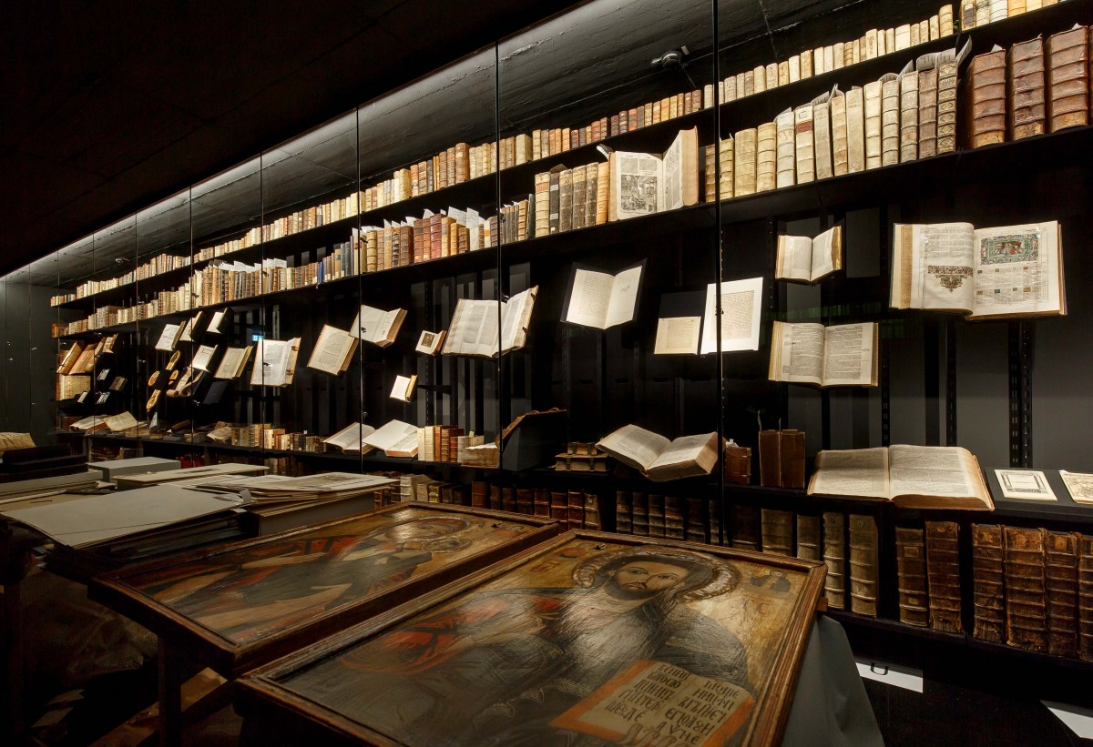 Der dunkle Raum, die Beleuchtung und Klimaanlage sind notwendig, um die wertvollen Gegenstände des Bibelmuseums zu schützen. „Sehr viele Exponate benötigen eine besondere Konservierung. Pergament beispielsweise lebt noch. Es gibt Feuchtigkeit ab und nimmt welche auf. Wir stellen Stücke aus ganz unterschiedlichen Materialien wie Papier, Papyrus, Leder oder Holz aus“, erläutert Kustos Dr. Jan Graefe. In den vergangenen fünfeinhalb Jahren war das Bibelmuseum – eines von acht deutschlandweit – für die inhaltliche und ausstellungstechnische Neukonzeption geschlossen. Mit der Wiederöffnung am 13. Dezember werden auf einer Ausstellungsfläche von rund 160 Quadratmetern zukünftig 1.500 Exponate präsentiert. Erstmals sind die 650 altsprachlichen Bibeln der Sammlung „Walter Remy“ zu sehen.