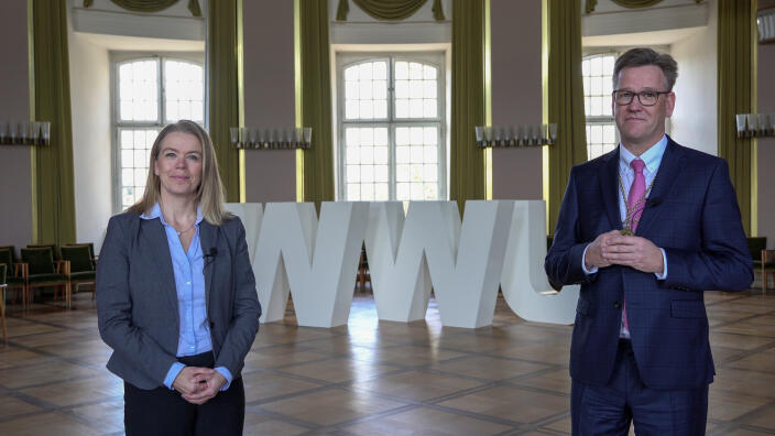 Die Redewendung, wonach man Feste feiern sollte, wie sie fallen, gilt zwar noch immer – nur passt sie in Zeiten der Pandemie nicht zu den Vorgaben des Infektionsschutzes. Prof. Dr. Johannes Wessels und Prof. Dr. Maike Tietjens ließen es sich dennoch nicht nehmen, den besten Doktorandinnen und Doktoranden des Jahres 2020 jetzt virtuell zu gratulieren. In einer Videobotschaft aus der Aula des Schlosses richteten sich der Rektor und die Prorektorin für strategische Personalentwicklung an die 117 Nachwuchswissenschaftler, die für ihre Dissertationen höchstes Lob und das bestmögliche Prädikat "summa-cum-laude" erhalten haben.