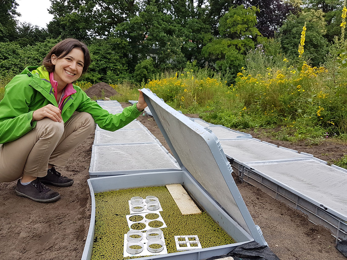 Flashback to a few weeks earlier: On the site of the former garden of medicinal plants at the Institute of Pharmaceutical Biology and Phytochemistry in Hittorfstraße, Dr. Meret Huber is kneeling in front of a row of small water tanks, all full of duckweed from one single genetic line. “What interests us,” she explains, “is whether plants without any genetic modifications can, over generations, adapt to stress factors such as an excess of copper.” Huber heads a team of researchers at the Institute of Biology and Biotechnology of Plants and is supervising Alexandra Chávez’ PhD dissertation together with Prof. Shuqing Xu from the IEB.