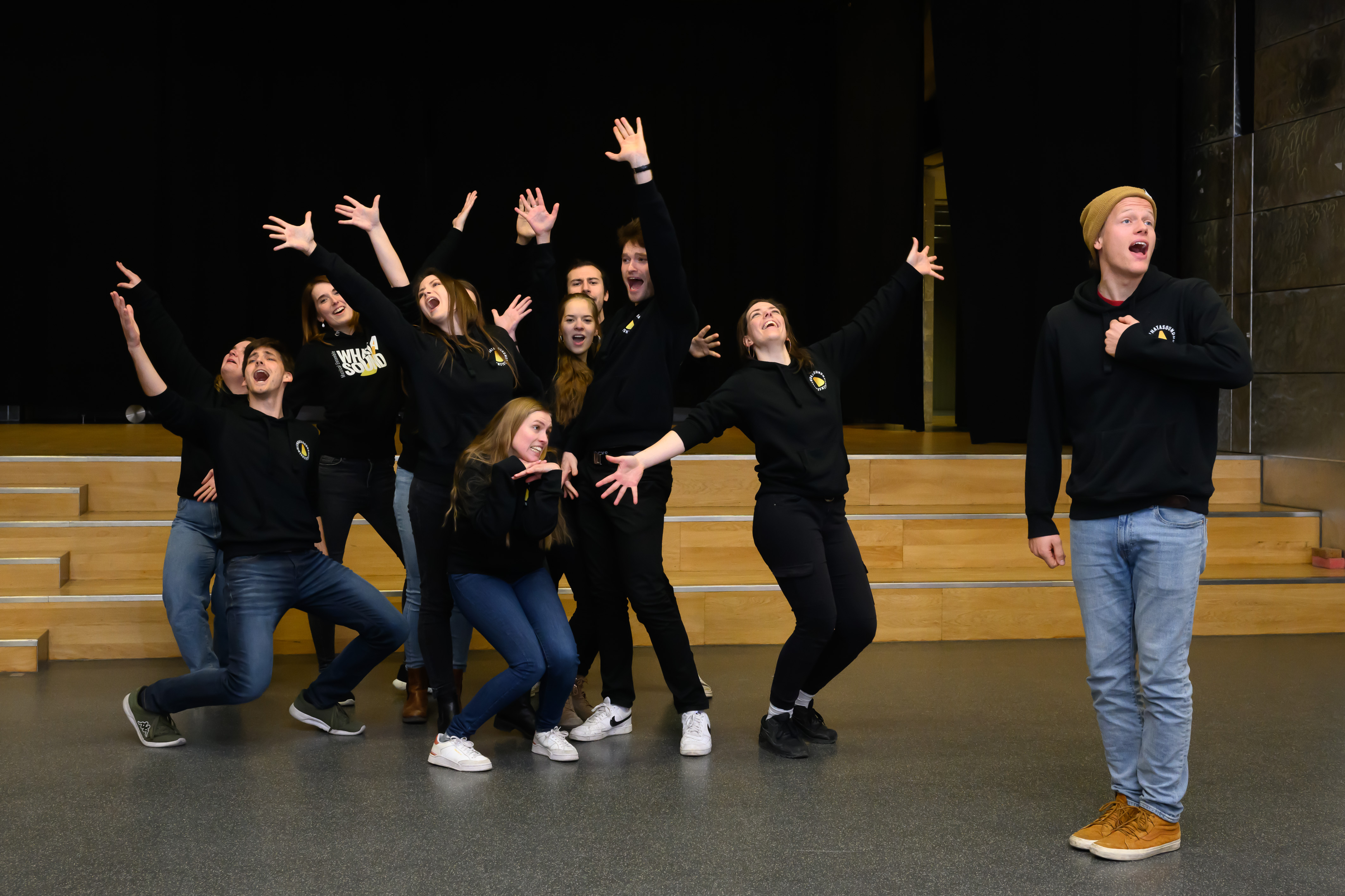 Szenen einer Probe: Das Musical-Ensemble „WhatASound“ zeigt beim Neue-Wände-Festival eine Collage von abstrakteren theatralen Szenen sowie Musical- und Popsongs. Zur Gruppe aus Studierenden und Alumni der WWU gehören 19 (semi-)professionelle Sängerinnen und Sänger sowie ein Pianist.<address>© WWU - Michael Möller</address>